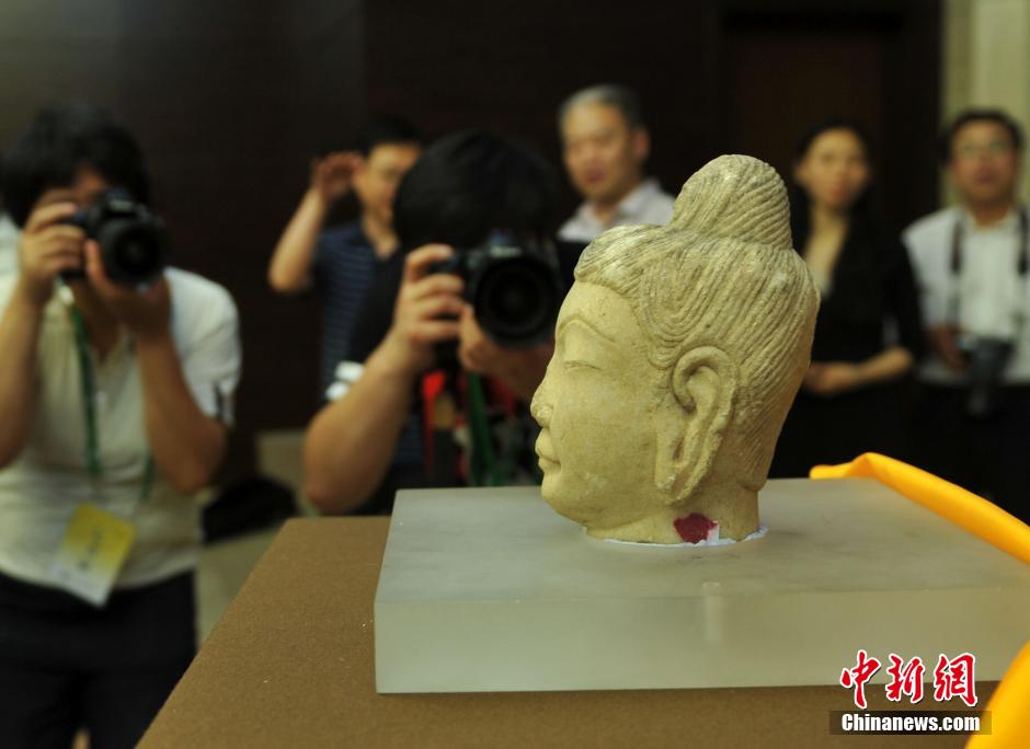 5月17日,市民郭鹏先生将收藏的唐代白石佛首捐献给河北博物院,千年古佛得以身首合璧。据该博物院介绍,郭鹏是在一位日本藏家众多藏品中发现的这尊唐代佛首,经过仔细观察,他认为有可能是河北博物院《曲阳石雕》展厅中南宫后底阁村出土的唐代白石佛座像上所遗失的佛首。经过反复磋商,最终郭鹏通过香港艺术品商会从日本藏家手中购得此物。回国后,经河北省文物鉴定中心专家组鉴定,该佛首与佛身确为一体无疑。 中新社发 翟羽佳 摄