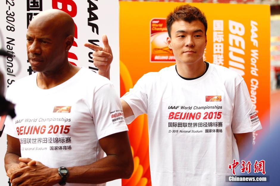5月14日,2015年北京国际田联世界田径锦标赛“倒计时100天”庆祝仪式在国家体育场庆典广场举行。三位田坛传奇人物科林·约翰逊,迈克·鲍威尔和迈克尔·约翰逊现身“鸟巢”,连同两位世锦赛推广大使李金哲、巩立姣,向全国体育爱好者推介这项难得的国际体育盛事。该项赛事将于今年8月22日至30日在“鸟巢”举办。图为活动前李金哲(右)搞怪迈克·鲍威尔。中新社发 富田 摄