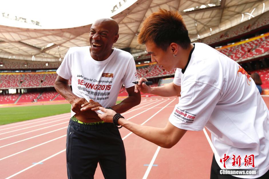5月14日,2015年北京国际田联世界田径锦标赛“倒计时100天”庆祝仪式在国家体育场庆典广场举行。三位田坛传奇人物科林·约翰逊,迈克·鲍威尔和迈克尔·约翰逊现身“鸟巢”,连同两位世锦赛推广大使李金哲、巩立姣,向全国体育爱好者推介这项难得的国际体育盛事。该项赛事将于今年8月22日至30日在“鸟巢”举办。图为活动前李金哲(右)搞怪迈克·鲍威尔。中新社发 富田 摄
