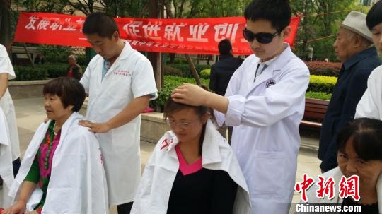 5月14日,山西省特殊教育中等专业学校以“发展职业教育成就出彩人生”为主题,带领19名老师、25名学生进入山西太原一社区提供免费按摩,以此培养学生们的就业能力。 刘小红 摄