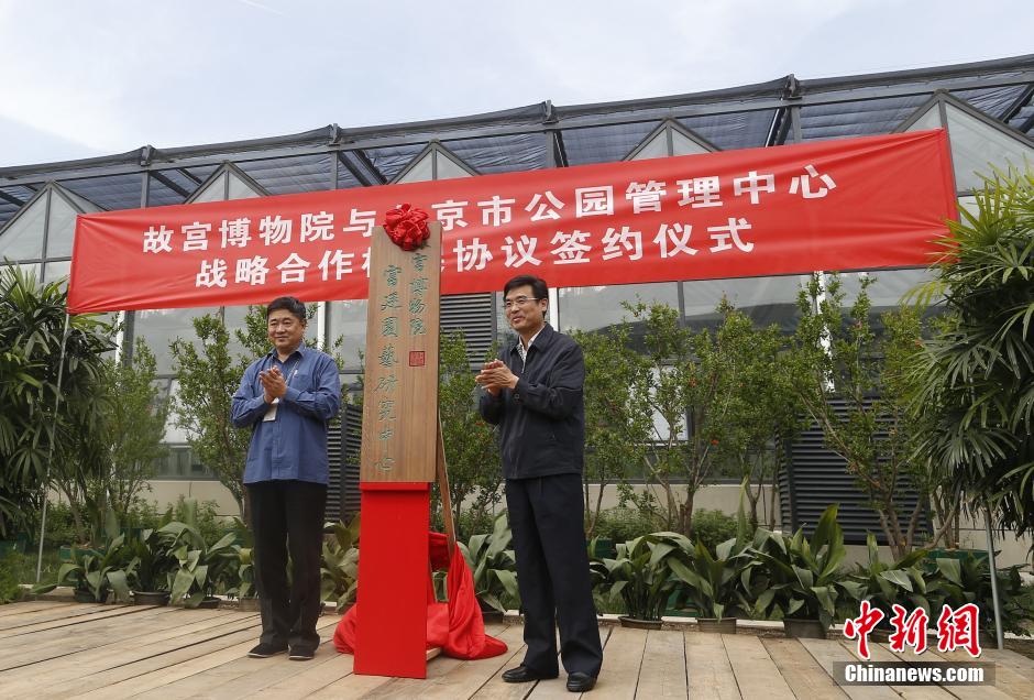 5月14日,故宫博物院宫廷园艺研究中心成立揭牌仪式在故宫北院区举行。此外,故宫博物院还与北京市公园管理中心签署了“战略合作框架协议”。单霁翔宣布,当天挂牌成立的宫廷园艺研究中心,将依托故宫北院区现有花房以及故宫院内保留的历史遗存、实物景观和档案研究资料等,开展研究工作。中新社发 张浩 摄