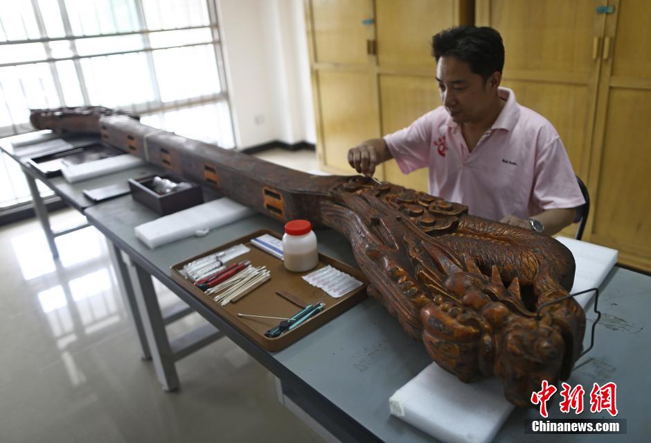 5月14日,一名师傅正在进行编钟架修复。中新社发 张浩 摄