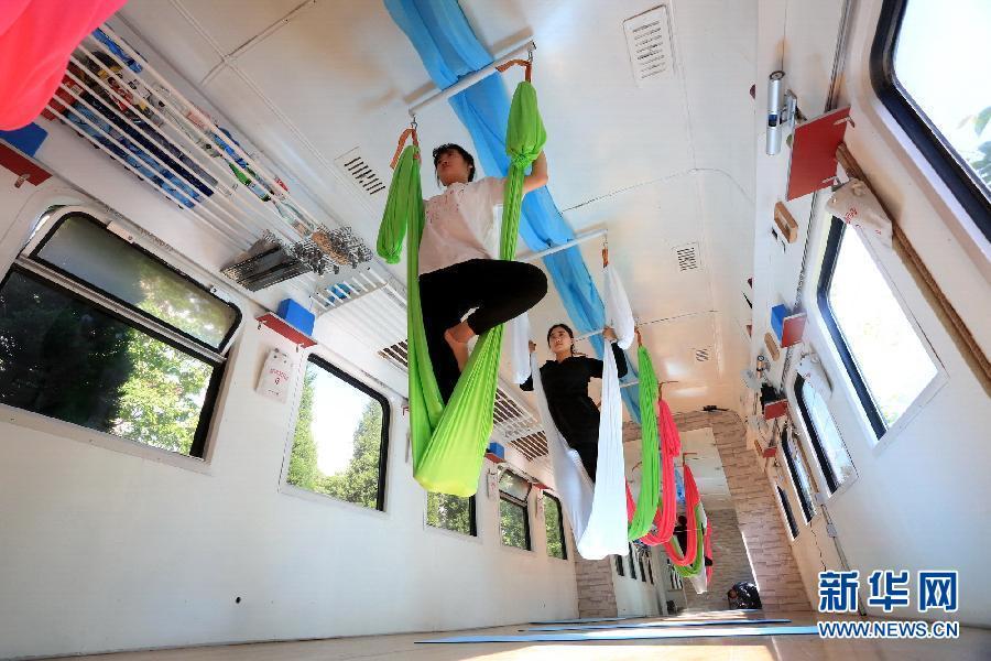 5月20日,在大连理工大学南门“旅途之生”火车主题创业街,学员在绿皮车上的瑜伽室内练习。新华社发(张春雷 摄)图片来源:新华网
