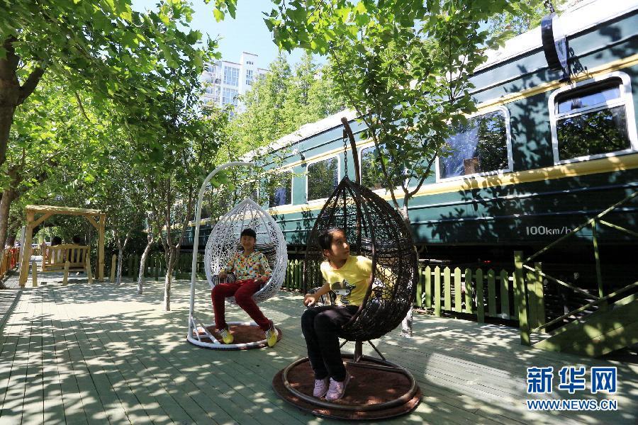 5月20日,在大连理工大学南门“旅途之生”火车主题创业街,两名小顾客在转椅上玩耍。新华社发(张春雷 摄)图片来源:新华网