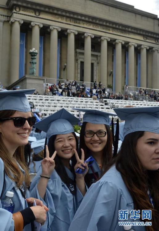 5月20日,几名来自中国的国际学生在哥伦比亚大学毕业典礼上。当天,美国哥伦比亚大学举行第261届毕业典礼,约15000名毕业生参加仪式,其中包括近600名中国学生。据“开放门户”统计,在2013至2014学年,被美国高等教育机构录取的中国学生人数从上一学年的235597人增加到274439人,增幅达16.5%,中国在所有派遣赴美留学生的国家中仍居第一位,其人数占美国国际生总数的31%。新华社记者王雷摄 图片来源:新华网