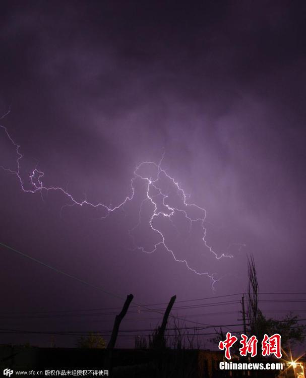 2015年6月20日,新疆维吾尔自治区阿克苏地区,当日23点左右,库车县塔里木乡突遇狂风肆虐,1分钟后暴雨夹杂着雷电,20分左右雨歇后,雷电持续,并出现蘑菇状闪电。袁欢欢 摄