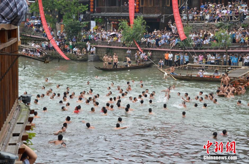 6月20日,正值中国传统佳节端午节,在湖南凤凰古城沱江河上举行了一场激烈的抢鸭子大赛。工作人员将鸭子从吊脚楼上抛下,居民与游客守在河中等待鸭子落水。龙炳忠 摄