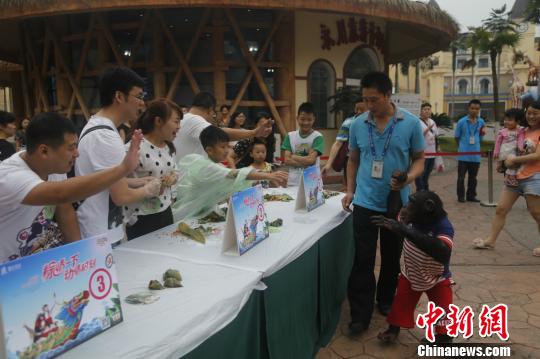 端午小长假期间,重庆乐和乐都的地球村举行了一场别开生面的包粽子比赛。此次包粽子比赛不是用的糯米大枣等食材,而是用的胡萝卜、苹果、桑树叶、猪肉等食材。因为做好的粽子将送到羊驼馆、孟加拉虎山、大羚羊馆、黑猩猩馆、长颈鹿馆给动物们品尝。比赛过程中,乐和乐都的形象大使猩猩珍妮还出差巡视一番,与包粽子的市民挥手致意,并对其中一位市民的粽子“垂涎欲滴”。