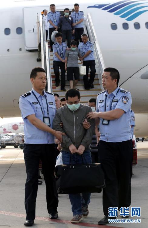 6月21日,公安人员在北京首都机场押解境外在逃经济犯罪嫌疑人走下飞机。当日,在中国驻印度尼西亚大使馆和印尼警方的大力支持和密切配合下,公安部“猎狐-2015”赴境外缉捕工作组将近期抓获的6名境外在逃经济犯罪嫌疑人吕某、陈某、林某、王某、张某、傅某从印尼押解回国。今年以来,全国公安机关已先后从30多个国家和地区抓获境外在逃经济犯罪嫌疑人256人。新华社记者 李明放 摄 图片来源:新华网