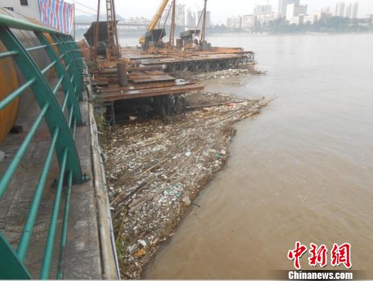 6月21日,广西柳州市滨江西路西来寺段正在建设中放生观光台的施工平台下方河面,集结着面积约100余平方米的垃圾,垃圾中有竹子、树木、泡沫、草末等物质。玄佳 摄