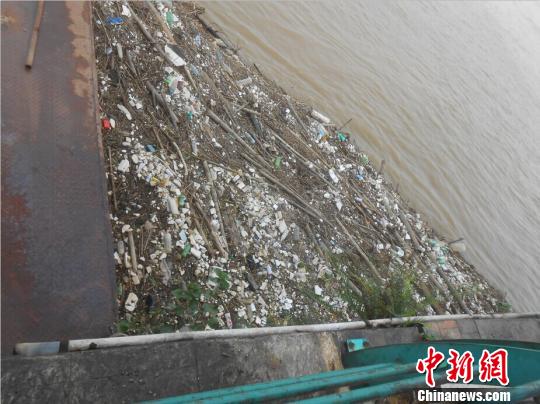 6月21日,广西柳州市滨江西路西来寺段正在建设中放生观光台的施工平台下方河面,集结着面积约100余平方米的垃圾,垃圾中有竹子、树木、泡沫、草末等物质。玄佳 摄