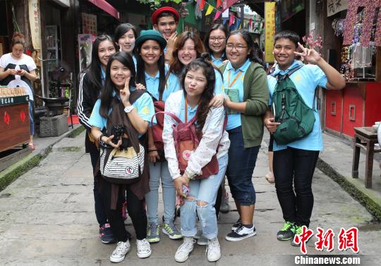 图为华裔青少年在磁器口古镇里合影留念。周毅 摄