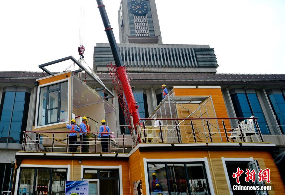 6月20日,在河北石家庄解放广场,施工人员在快速得组装绿色3D模块化房屋。当日,来自某公司的施工人员在石家庄的三个不同地点同时开工,举行快速组装绿色3D模块化房屋现场演示,向市民展示快速组装模块化精装修房屋的新技术。这种以建筑垃圾和矿产废料为原料制成的新型绿色建材,不仅符合国际循环经济的自然环保理念,更重要的是用它组装的房屋建筑绿色无污染、防火抗震,在施工作业期间可做到零污染、无水化,施工周期比传统盖房时间缩短了三分之二。中新社发 陆欣 摄