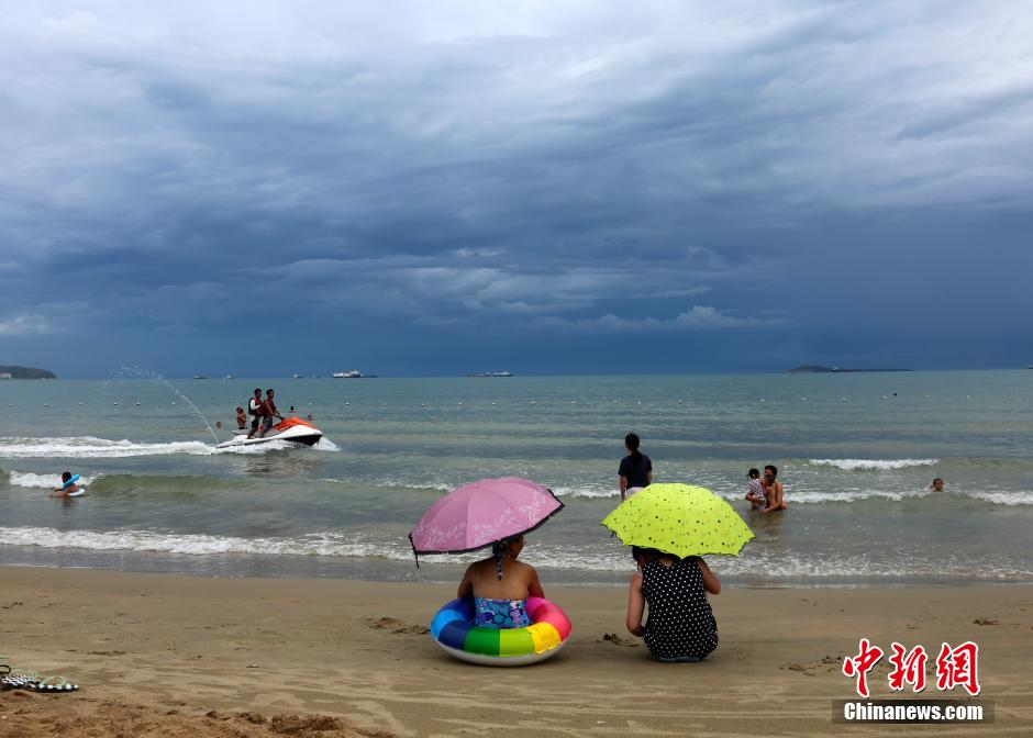 6月21日,海南省三亚市,市民游客在乌云密布的三亚湾游玩。中新社发 尹海明 摄
