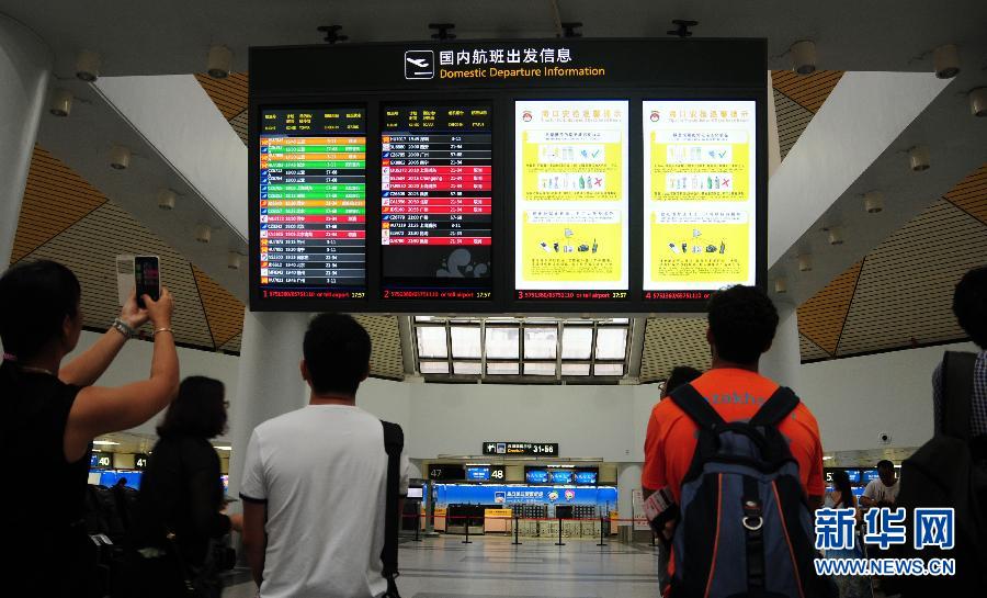 6月22日,几名旅客在海口美兰机场关注航班动态。受2015年第8号台风“鲸鱼”影响,截至22日19时30分,海口美兰机场取消航班63架次,其中进港49架次,出港14架次。美兰机场已通知各单位随时跟踪航班动态,并做好各单位信息传递工作,配合航空公司做好旅客通知以及旅客就住安排等事宜。新华社记者王晖余摄