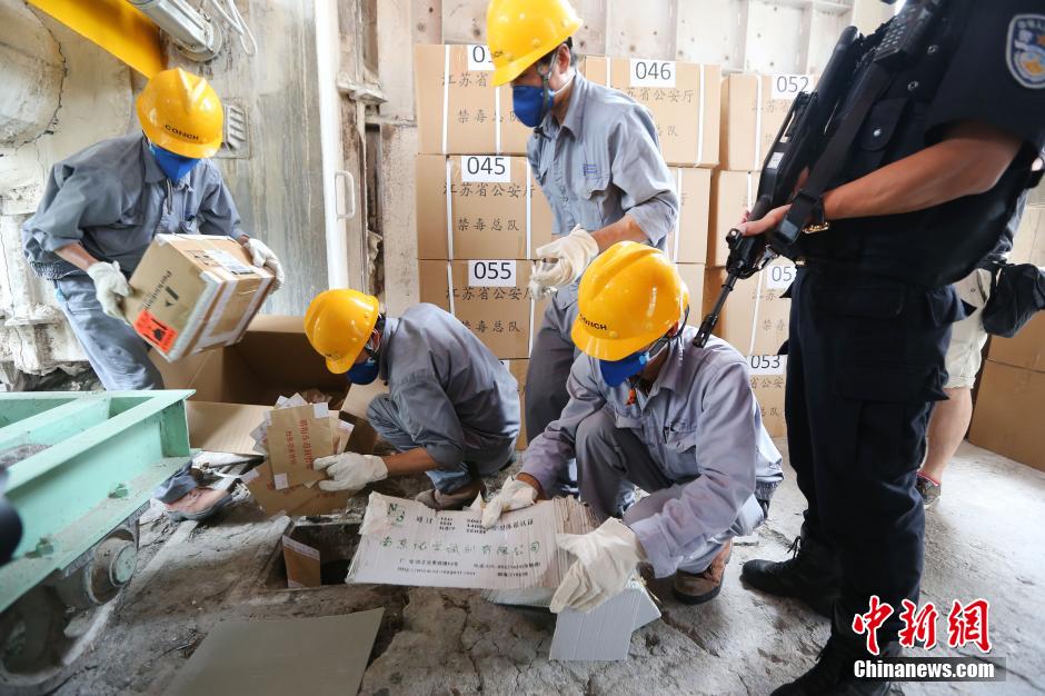 6月24日,江苏省公安厅在南京市栖霞区一家水泥厂举行集中销毁毒品活动,现场对近年来全省公安机关缴获的884.3千克毒品进行无害化销毁。中新社发 泱波 摄