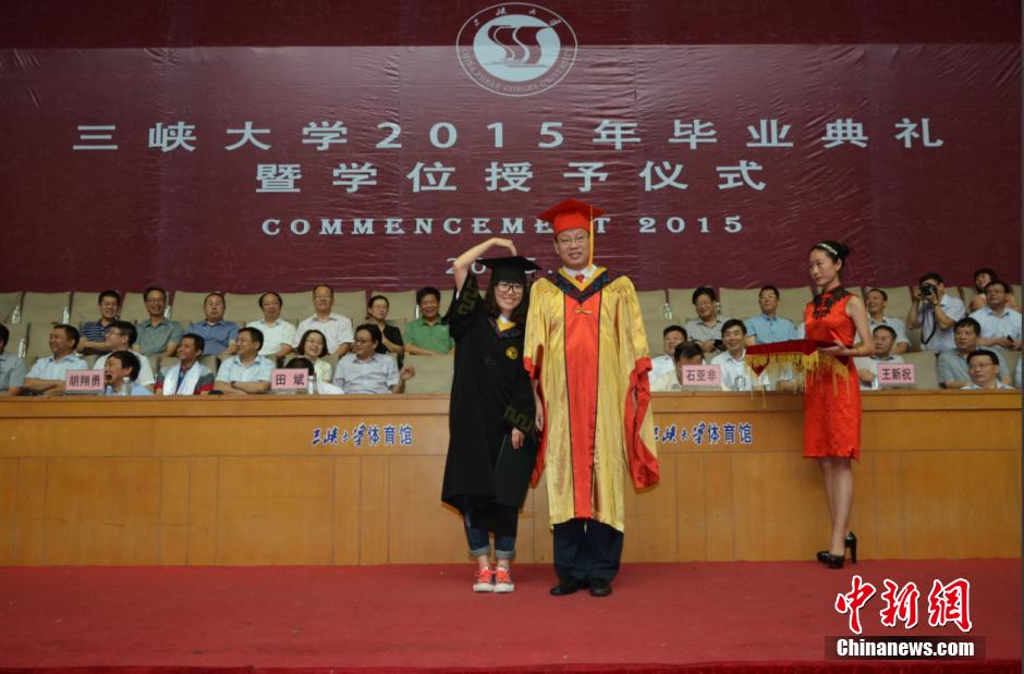 近日举行的三峡大学本科生毕业典礼上,该校校长何伟军为毕业生授学位,却遇见不少“调皮”大学生摆出各类夸张或怪异动作求合影,何伟军皆笑脸相迎尽力配合,被赞“和蔼可亲”。余东山 摄
