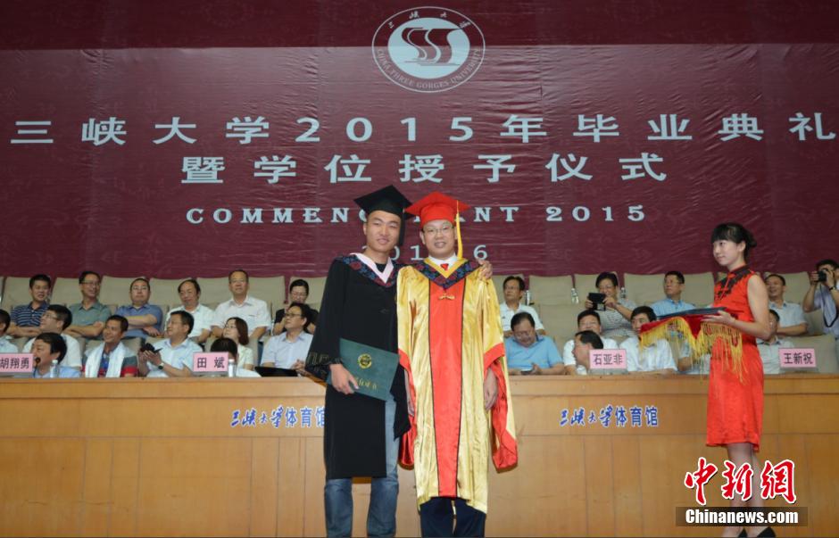 近日举行的三峡大学本科生毕业典礼上,该校校长何伟军为毕业生授学位,却遇见不少“调皮”大学生摆出各类夸张或怪异动作求合影,何伟军皆笑脸相迎尽力配合,被赞“和蔼可亲”。余东山 摄