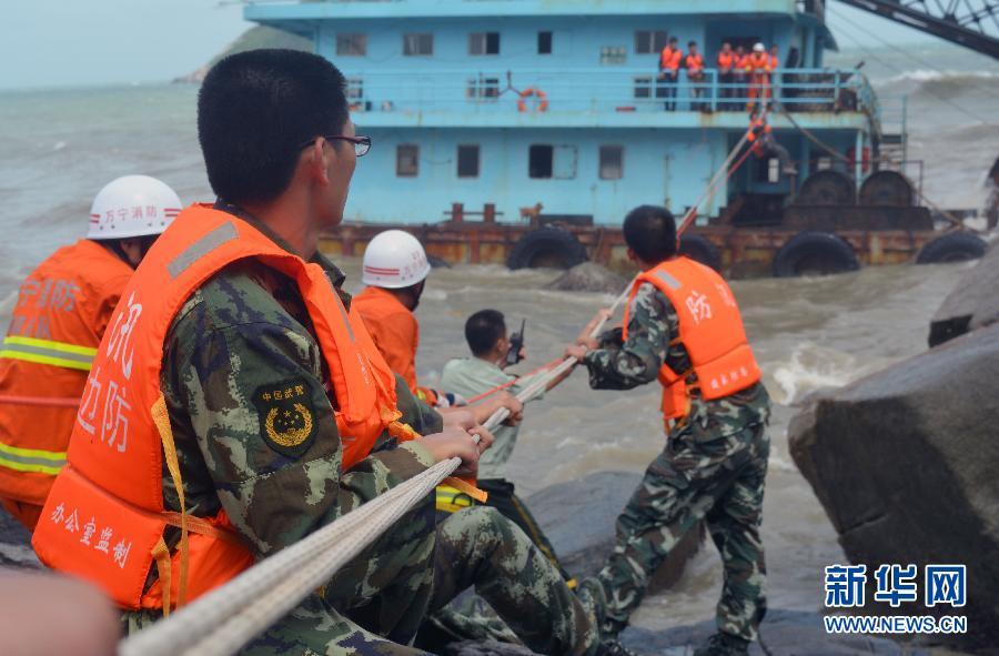 6月23日,武警官兵采取索降法将被困船员转移上岸。记者从海南省万宁市边防支队获悉,23日,受今年第8号台风“鲸鱼”影响,万宁市乌场附近海域有2艘广东籍渔船共11人遇险,目前有7人获救,仍有一艘渔船失联,船上有4名船员。对于失联渔船和船员,万宁边防支队乌场边防派出所正在附近海域搜救。 图片来源:新华网