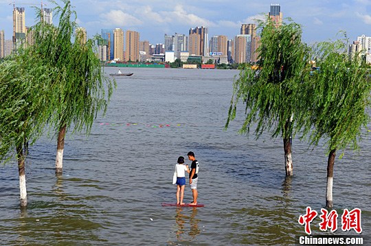 6月24日,武汉市民在被长江水淹没汉口江滩亲水平台戏水避暑。夏至节气后,江城武汉天气格外晴朗,最高气温飙至30℃以上。中新社发 张畅 摄
