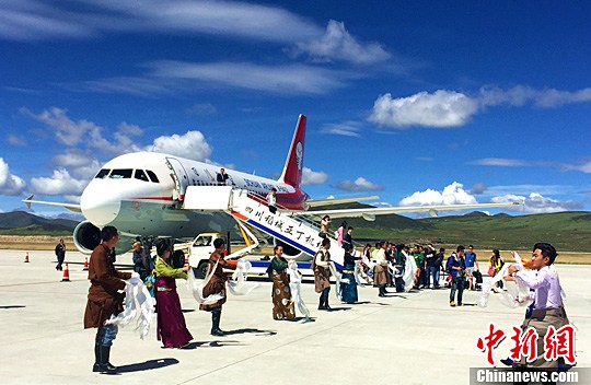 四地同飞首航航班抵达稻城亚丁机场。刘忠俊 摄