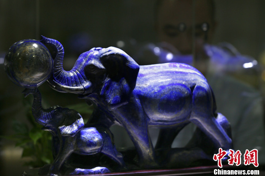 6月24日,民众在北京潘家园市场欣赏青金石精品。中新社发 富田 摄