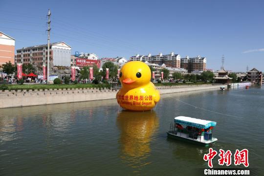 巨型大黄鸭“畅游”甘肃敦煌水景