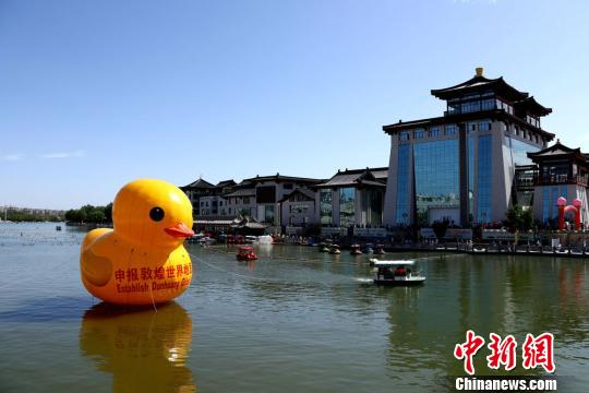 图为憨态可掬、乖巧可爱的“大黄鸭”首次“畅游”戈壁城市敦煌水景。 张晓亮 摄