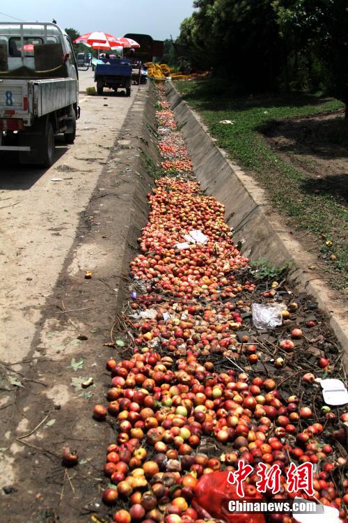 陕西周至油桃滞销 果农倾倒路旁水沟