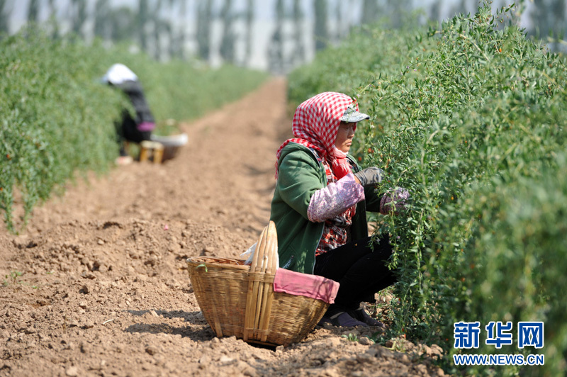在宁夏中宁县舟塔乡,当地农户在采摘枸杞鲜果(6月25日摄)。