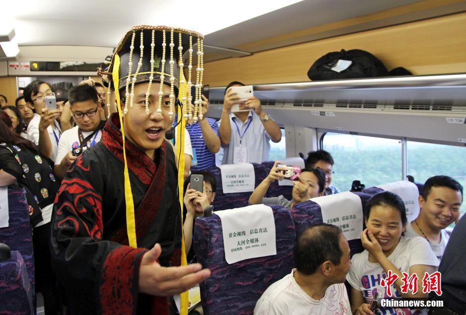 6月26日上午7时15分,郑州站至焦作站的C2900次动车组列车驶出郑州站,标志着郑(州)焦(作)铁路正式开通运营。首趟列车运行途中,焦作市一家古装影视城的演员们身穿古装扮成“秦王”、“大臣”出现在动车上,为乘客即兴表演节目、互动合影,连连赞叹郑焦铁路的舒适快捷。郑焦城际铁路于2010年开工建设,2014年由中铁电气化局三公司启动电气化建设,2015年3月开始联调联试。郑焦铁路动车组线路全长78公里,设郑州、南阳寨、黄河景区、武陟、修武西、焦作6个车站。设计时速为250公里,运行时间由原来的2个多小时缩短至平均40分钟,速度最快时仅需34分钟,这与郑州至焦作的城际大巴和普通火车相比既安全又快捷。动车组运行初期每天开行D字头动车组列车5对10趟,待7月1日运行图调整后,将每日开行9对18趟动车组列车。中新社发 王子瑞 摄