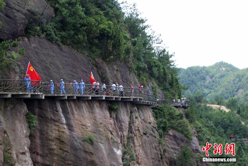 6月27日,身着红军服的老党员吸引了民众的目光。当天,为庆祝中国共产党建党94周年,湖南平江革命老区的老党员挥舞党旗从位于湘鄂赣三省交汇处的石牛寨出发,徒步穿越湘鄂赣,重返根据地,用实际行动倡导弘扬红色精神。这些老党员年纪最大的86岁,党龄最长的有50年。中新社发 杨华峰 摄