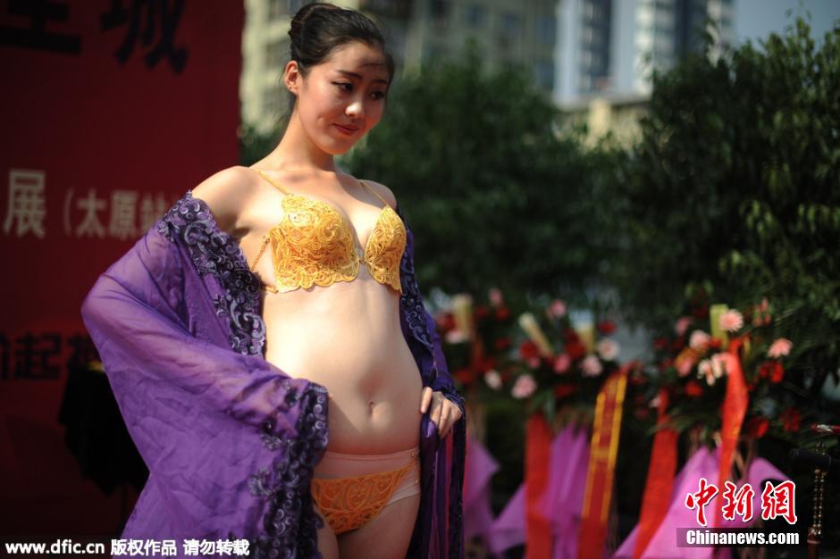 2015年6月27日,山西省太原市街头,一位性感女模身着黄金内衣亮相一家金店庆典活动现场,吸引了众多市民的目光。据活动负责人介绍,这套手工制作而成的纯金内衣,重达4公斤,每套价值400万元。 刘江 摄