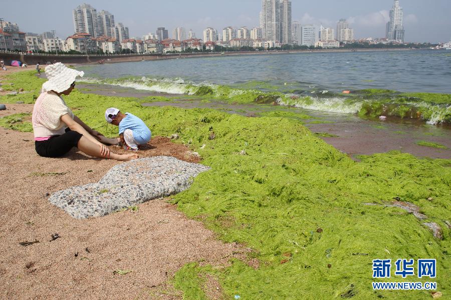 6月27日,游客坐在被浒苔入侵的青岛海滨。新华社发 黄杰显 摄 摄 图片来源:新华网