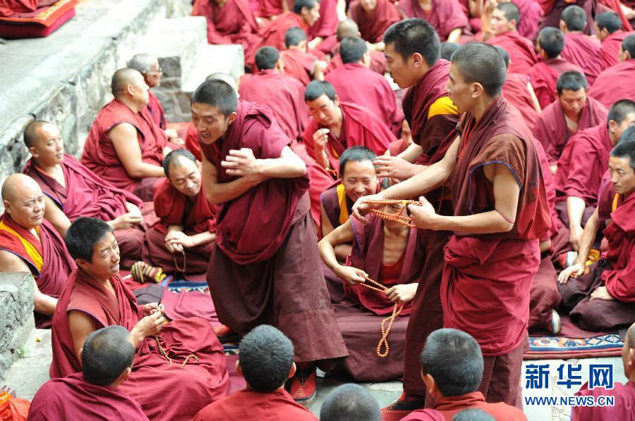 6月28日,僧人在扎什伦布寺辩经法会上。 6月26日至28日,西藏日喀则市扎什伦布寺100多名僧人举行辩经法会。僧人们分成几个小组席地而坐,提问者站立,拍手跺脚,变换着各种手势,频频发问,围坐者引经据典,沉着应答。辩经现场击掌声、追问声、奚落声四起,气氛热烈。新华社记者 张汝锋 摄
