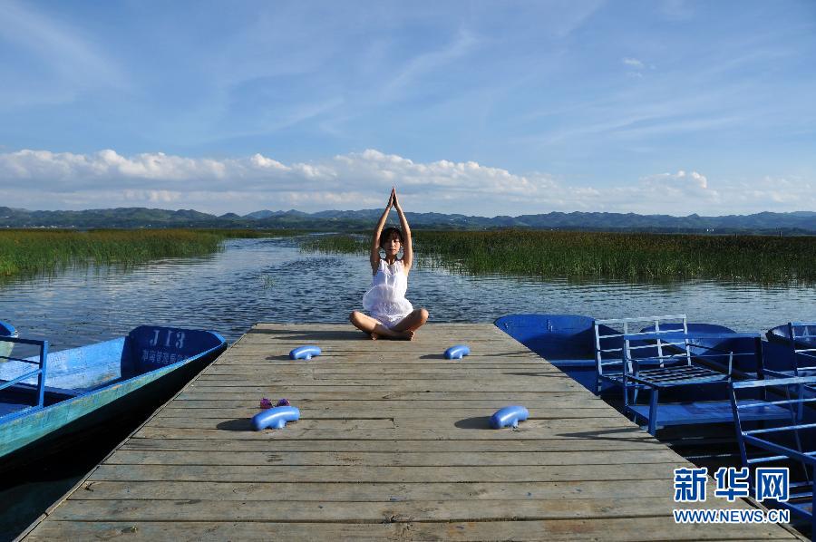 6月29日,一名瑜伽爱好者在贵州草海湿地做瑜伽。连日来,拥有夏日凉爽气候特征及高原草海湿地风光的贵州草海湿地吸引了大批游客前来观光避暑。 新华社发(杨文斌 摄)