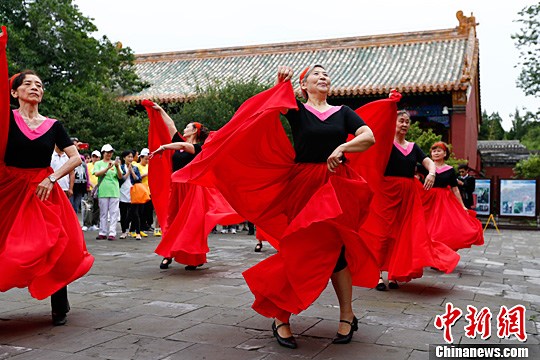 6月30日,百名老运动员、老教练员与北京民众一起在北海公园进行快乐健步走活动,以助力北京申办2022年冬奥会。中新社发 富田 摄