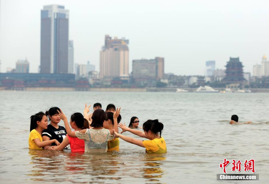 6月30日,“火炉”南昌连续多日迎来高温“桑拿”天气,当日最高气温达37度,市民纷纷来到赣江边上纳凉,也有不少熟悉水性的市民下水畅游,或走入浅水区戏水享受清凉,江滩现场如一片露天“浴场”。有关部门提醒,夏日在江湖中戏水游泳有危险,尤其是中小学生去江、湖中游泳务必由大人陪同并携带救生设备,以免发生意外。姜涛 摄