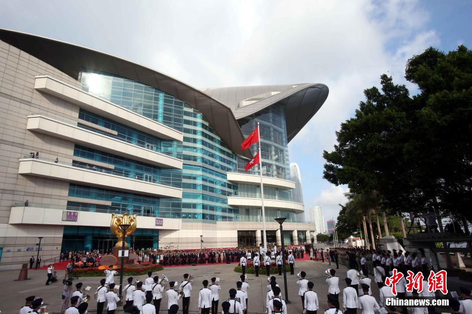 7月1日上午,全国政协副主席董建华、香港特区行政长官梁振英、中央驻港联络办主任张晓明等在金紫荆广场出席升旗仪式,庆祝香港特别行政区成立十八周年。 中新社发 洪少葵 摄