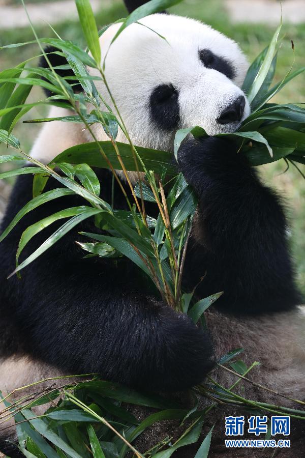 6月29日,在澳门大熊猫馆,大熊猫“心心”在吃竹叶。中央政府新赠澳门大熊猫“开开”、“心心”公开亮相一个月,得到澳门社会各界特别是小朋友的喜爱。近日,记者探访了熊猫“前庭后舍”,深入了解“开开”、“心心”在澳门“食”“住”“学”的生活情况。新华社记者张金加摄