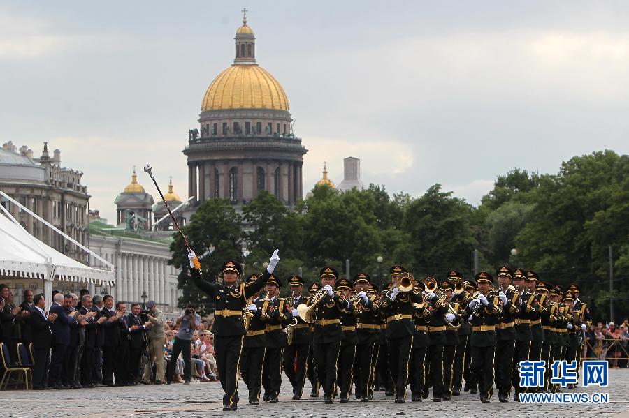 6月30日,中国人民解放军军乐团在俄罗斯圣彼得堡冬宫前的宫廷广场上表演。当日,上海合作组织成员国第二届军乐节在俄罗斯圣彼得堡举行。中国人民解放军军乐团和其他成员国的军乐团共同为市民和游客带来精彩的演出。新华社记者鲁金博摄