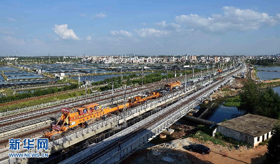 6月30日,铺轨车在进行西环铁路最后一段钢轨铺设。当日,海南西环铁路全线铺轨正式完成,与东环铁路完成闭环,标志着海南环岛高铁正式贯通。海南西环铁路建成通车后,岛内铁路沿线任意两市县间将实现3小时内通达,形成海岛“三小时经济圈”。据了解,新建海南西环铁路是海南省“十二五”基础设施工程,也是迄今为止海南投资规模最大的基础设施建设项目。海南西环铁路北起海口市,南至三亚市,沿海岛西部沿海,经过澄迈、临高、儋州、昌江、东方、乐东6个市县,设16个车站,为双线I级电气化客货共线铁路,设计速度每小时200公里,正线全长345公里,项目总投资约271亿元。工程于2014年12月18日开始铺轨,预计今年年底达到开通条件。新华社记者郭程摄