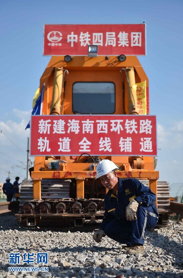 6月30日,工人在西环铁路铺轨施工现场调整钢轨中轴线。当日,海南西环铁路全线铺轨正式完成,与东环铁路完成闭环,标志着海南环岛高铁正式贯通。海南西环铁路建成通车后,岛内铁路沿线任意两市县间将实现3小时内通达,形成海岛“三小时经济圈”。据了解,新建海南西环铁路是海南省“十二五”基础设施工程,也是迄今为止海南投资规模最大的基础设施建设项目。海南西环铁路北起海口市,南至三亚市,沿海岛西部沿海,经过澄迈、临高、儋州、昌江、东方、乐东6个市县,设16个车站,为双线I级电气化客货共线铁路,设计速度每小时200公里,正线全长345公里,项目总投资约271亿元。工程于2014年12月18日开始铺轨,预计今年年底达到开通条件。新华社记者郭程摄