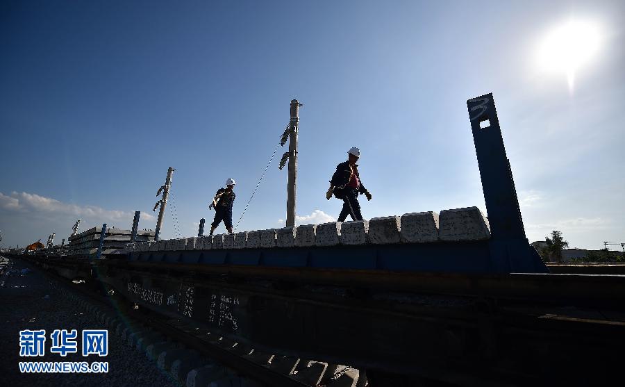 6月30日,工人在西环铁路铺轨施工现场铺轨车上工作。当日,海南西环铁路全线铺轨正式完成,与东环铁路完成闭环,标志着海南环岛高铁正式贯通。海南西环铁路建成通车后,岛内铁路沿线任意两市县间将实现3小时内通达,形成海岛“三小时经济圈”。据了解,新建海南西环铁路是海南省“十二五”基础设施工程,也是迄今为止海南投资规模最大的基础设施建设项目。海南西环铁路北起海口市,南至三亚市,沿海岛西部沿海,经过澄迈、临高、儋州、昌江、东方、乐东6个市县,设16个车站,为双线I级电气化客货共线铁路,设计速度每小时200公里,正线全长345公里,项目总投资约271亿元。工程于2014年12月18日开始铺轨,预计今年年底达到开通条件。新华社记者郭程摄