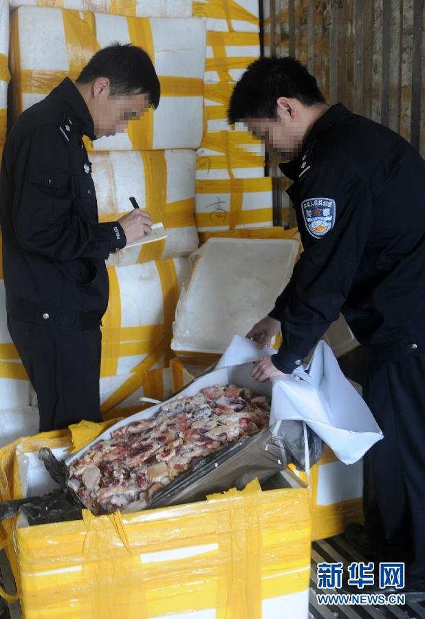 广西缉私警察查获走私冻品(3月9日摄)。新华社发