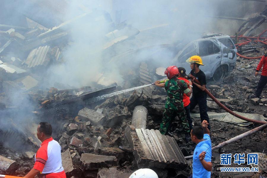 6月30日,在印度尼西亚北苏门答腊省棉兰,消防员在运输机坠毁现场灭火。一架印尼军用运输机当天在印尼苏门答腊省首府棉兰市中心坠毁,目前已造成至少30人死亡。 新华社发(金廷摄)