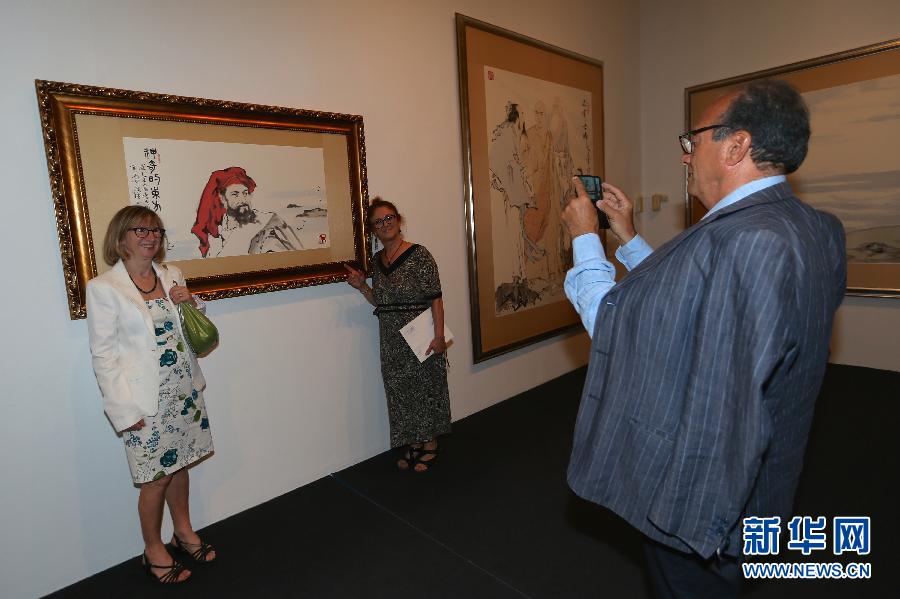 6月30日,在意大利罗马,参观者与范曾创作的马可波罗像合影。当日,“范曾,文明的交响乐”书画展在意大利罗马维多利亚诺宫开幕,展出100余件书画作品。时值中意建交45周年,范曾特意为此次展览创作了旅行家马可波罗像、意大利文艺复兴时期艺术家米开朗基罗像、明代万历年间来到中国的传教士利玛窦像等有关意大利的作品。本次展览将持续至9月27日。新华社记者金宇摄