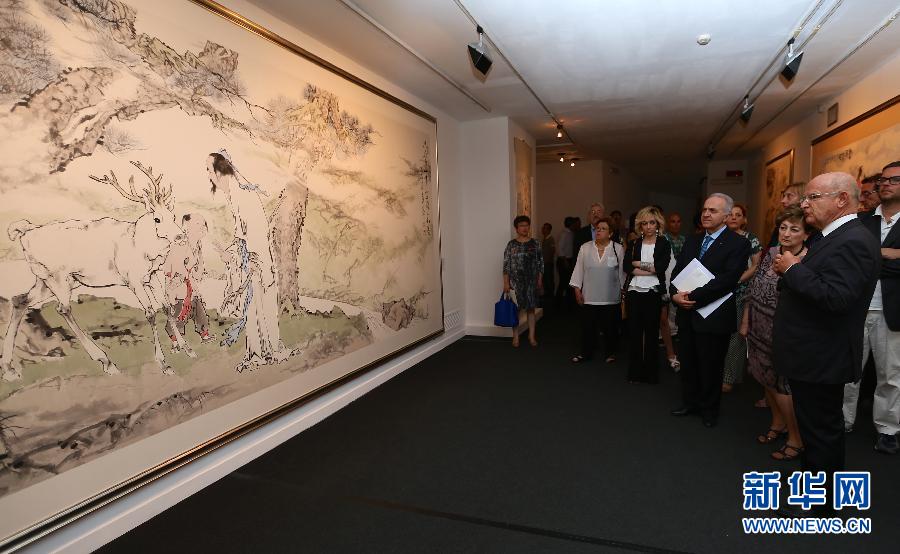 6月30日,在意大利罗马,“范曾,文明的交响乐”书画展策展人、意大利总统文化顾问路易斯·高塔特(前右一)在为参观者介绍作品。当日,“范曾,文明的交响乐”书画展在意大利罗马维多利亚诺宫开幕,展出100余件书画作品。时值中意建交45周年,范曾特意为此次展览创作了旅行家马可波罗像、意大利文艺复兴时期艺术家米开朗基罗像、明代万历年间来到中国的传教士利玛窦像等有关意大利的作品。本次展览将持续至9月27日。新华社记者金宇摄