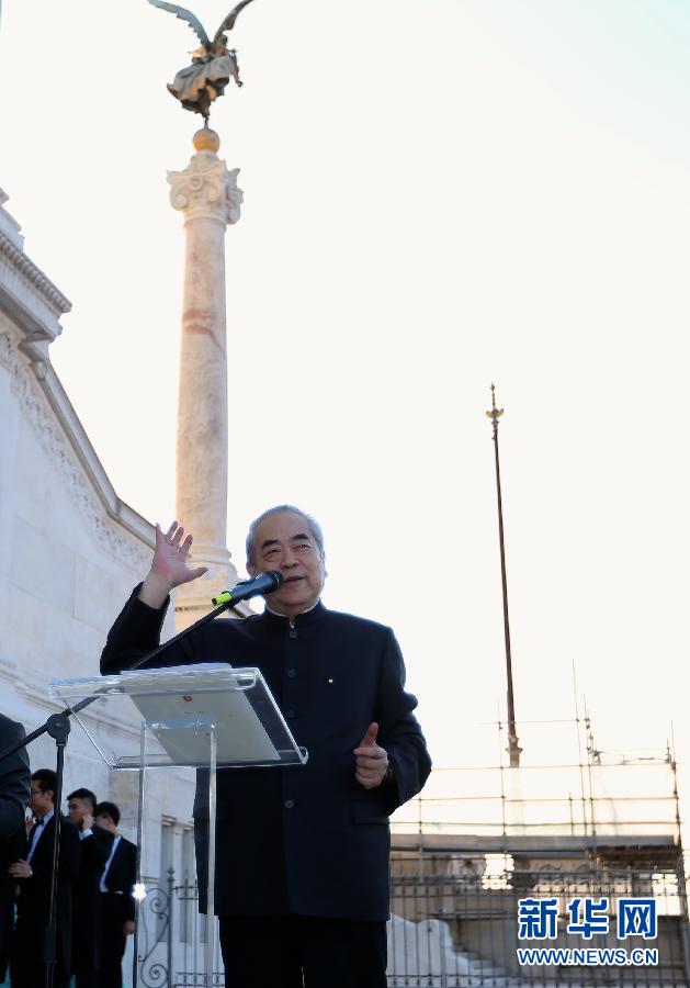6月30日,在意大利罗马,范曾在书画展开幕式上讲述创作灵感。当日,“范曾,文明的交响乐”书画展在意大利罗马维多利亚诺宫开幕,展出100余件书画作品。时值中意建交45周年,范曾特意为此次展览创作了旅行家马可波罗像、意大利文艺复兴时期艺术家米开朗基罗像、明代万历年间来到中国的传教士利玛窦像等有关意大利的作品。本次展览将持续至9月27日。新华社记者金宇摄