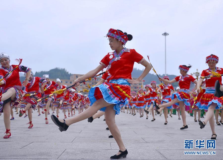 6月29日,居民在湖北省宣恩县人民广场参加集体舞活动。当日,湖北省恩施土家族苗族自治州宣恩县3000余名土家族、苗族群众组成42支代表队,展演当地特色的“滚龙连厢”集体舞,喜迎“七一”党的生日。  新华社发(宋文 摄)